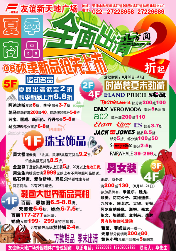 北方網時尚訊:友誼新天地廣場——夏季商品全面出清2折起,08秋季新品搶先上市。