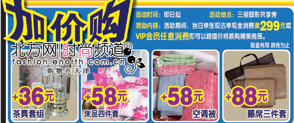 活動內容:活動期間,當日單張現沽單現金消費滿299元/VIP會員任意消費即可以超值價格換購指定商品。(數量有限,換完爲止)