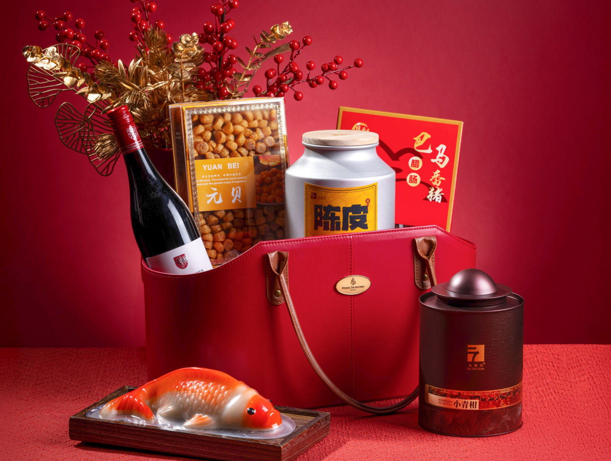 另有新春鴻運禮籃,將元貝、新會陳皮、椰汁年糕魚等珍選之味,裝入中國紅的皮質禮籃,是饋贈親友的理想之選。
