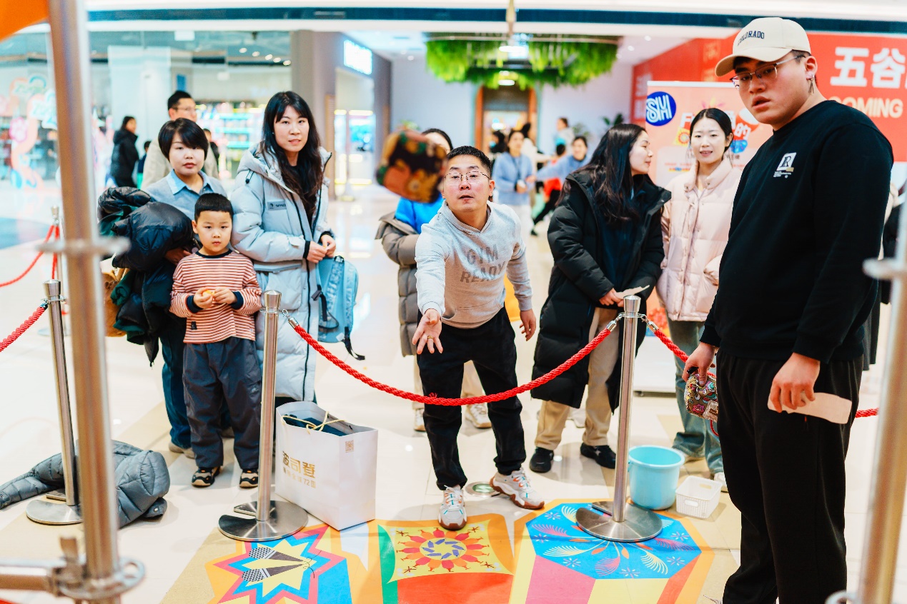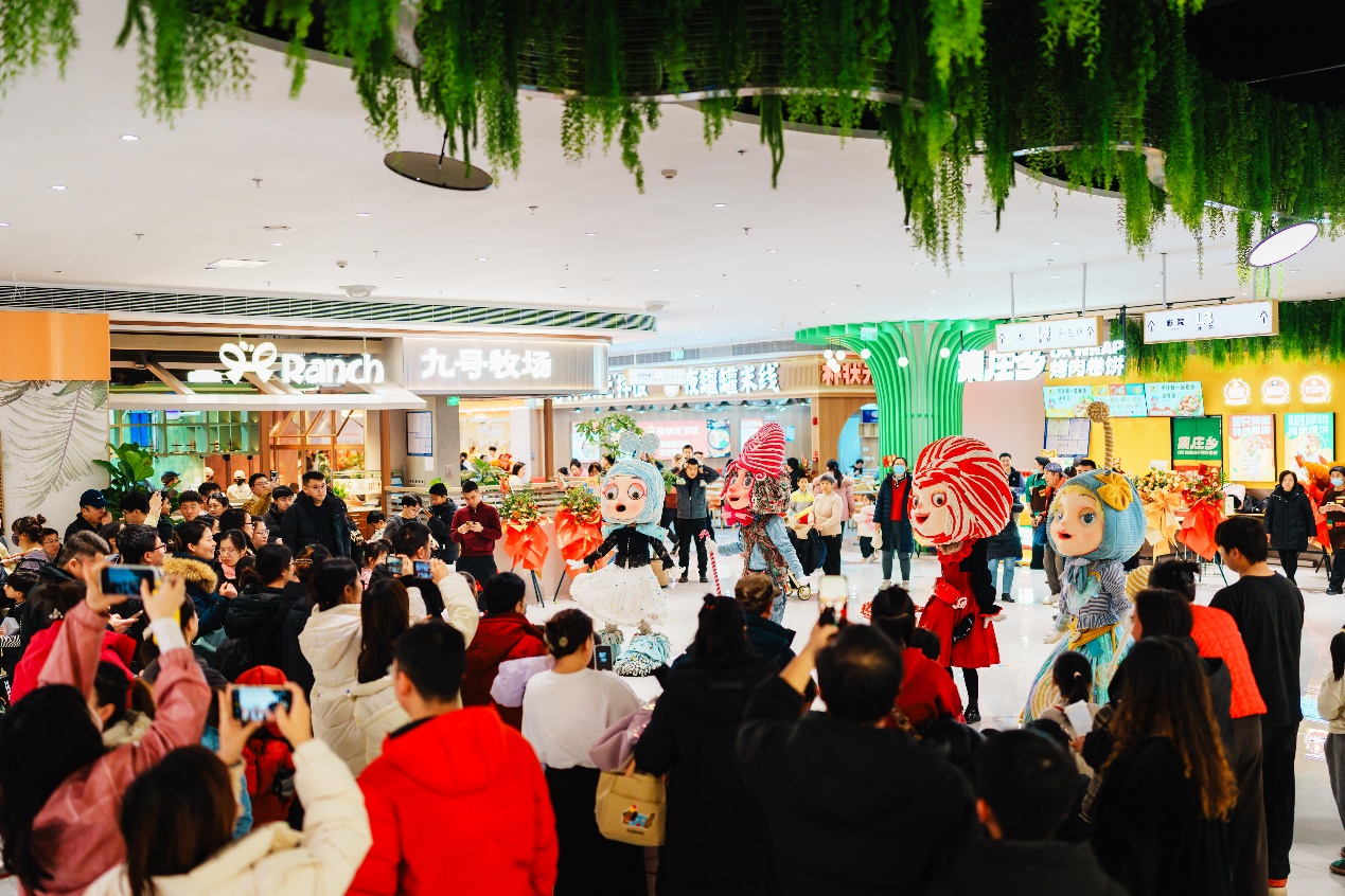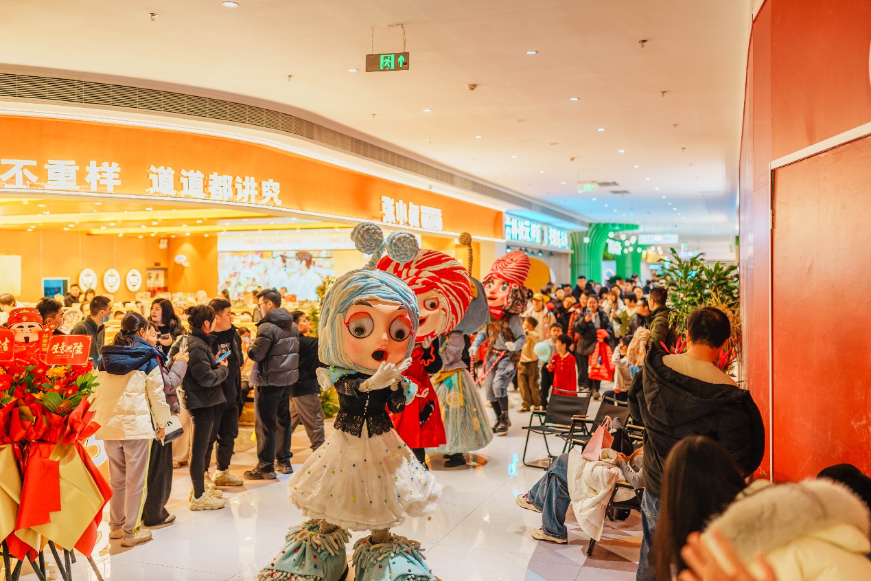 為慶祝這一重要時刻,SM廣場傾力打造了“惠”聚人氣的開業盛典。早在開業前夕,商場便通過線上渠道釋放重磅補貼,推出“25元團50元”、“70元團100元”等多檔代金券,實現消費立減。顧客在美食區打卡集章,可兌換獨家限定周邊;累計消費滿額更可參與抽獎,贏取繽紛好禮。除了實實在在的讓利,一場充滿奇思妙想的藝術之旅也隨之開啟。1月17日至18日,曾受邀參與烏鎮戲劇節古鎮嘉年華的哈珀劇團,攜原創IP劇目《糖果家族》登陸SM廣場,為顧客帶來了沈浸式互動表演,為商場增添了更多藝術活力。與之相映成趣的,是商場精心布置的美學場景:中庭上空,如幻夢傾瀉般的吊掛裝置,折射出璀璨的光之瀑布;三層空間內,翡翠流瀑般的天花藝術蜿蜒鋪展,讓人仿佛漫步於流動的色彩星河。這些投入,無不彰顯SM廣場致力於營造全方位煥新體驗的用心。